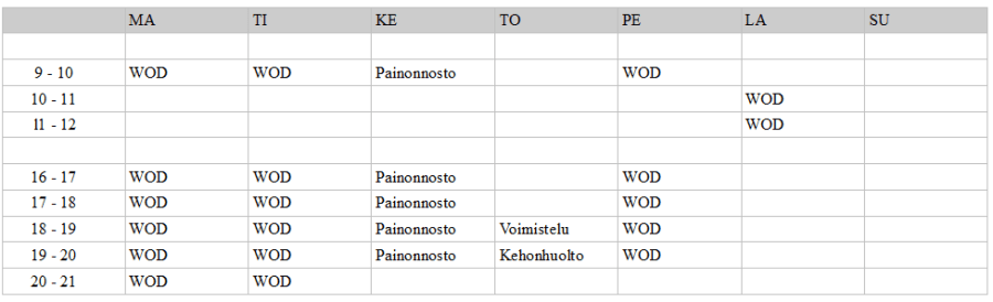 Workout of the Day, eli päivän treeni. Valmennettu treeni vaihtelee päivittäin ja se perustuu ohjelmointiin. Harjoittelemme progressiivisesti nousevalla kuormalla 3 viikkoa, minkä jälkeen tulee yksi kevyt viikko.